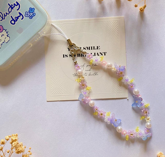 Handmade Pearl Beaded Phone Charm Strap: Butterfly Flower Chain