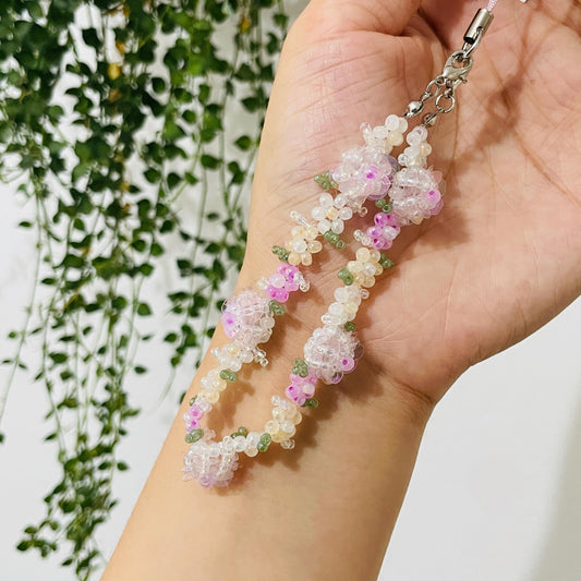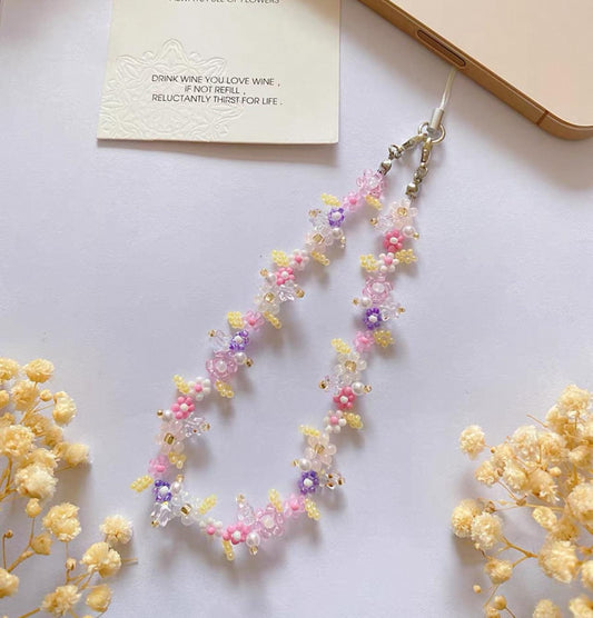 Floral Wonderland Phone Charm Strap Bracelet, Beaded Pink Flower Cell Phone Chain Bracelets, Handmade Phone Strap, Gift for Her