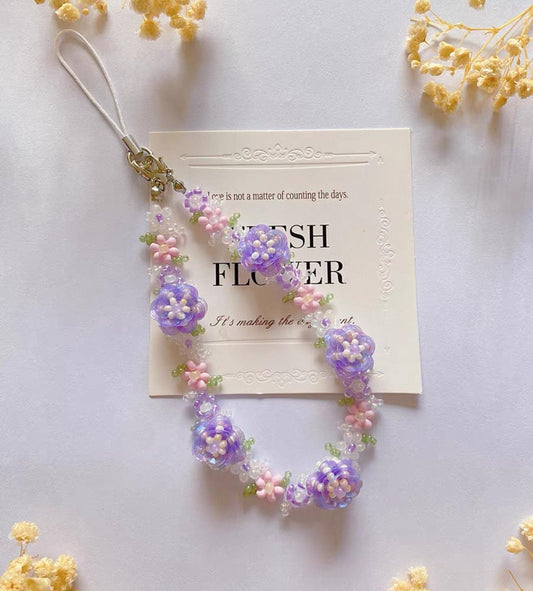 Handmade Purple Rose Beaded Phone Strap Bracelet: Floral Cell Phone Chain